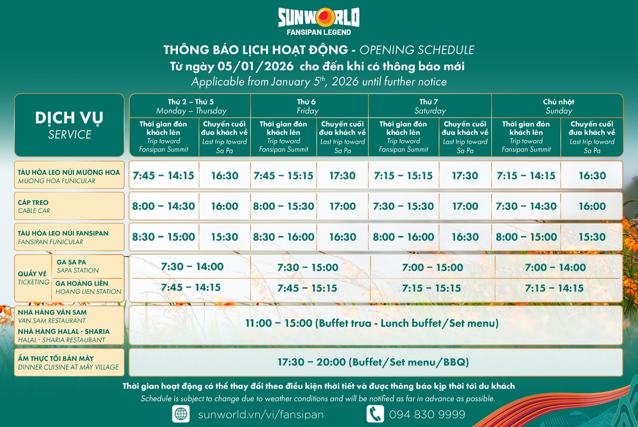 Giờ hoạt động của tuyến cáp treo có thể thay đổi tùy điều kiện thời tiết hoặc lịch bảo trì định kỳ. Quý khách nên kiểm tra thông báo cập nhật trên website trước khi lên kế hoạch tham quan.